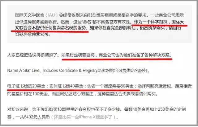 至于权威性和花费,自媒体人“长江公寓”分析:“国际天文学联合(IAU)不会提供任何售卖命名权的服务……如果粉丝要自嗨,商业公司也为他们准备了各种解决方案……电子证书版的20美金;实体证书版40美金;命名一个星座需要60美金;选择两颗亮度近似、距离相近的星星价格在100美金。”