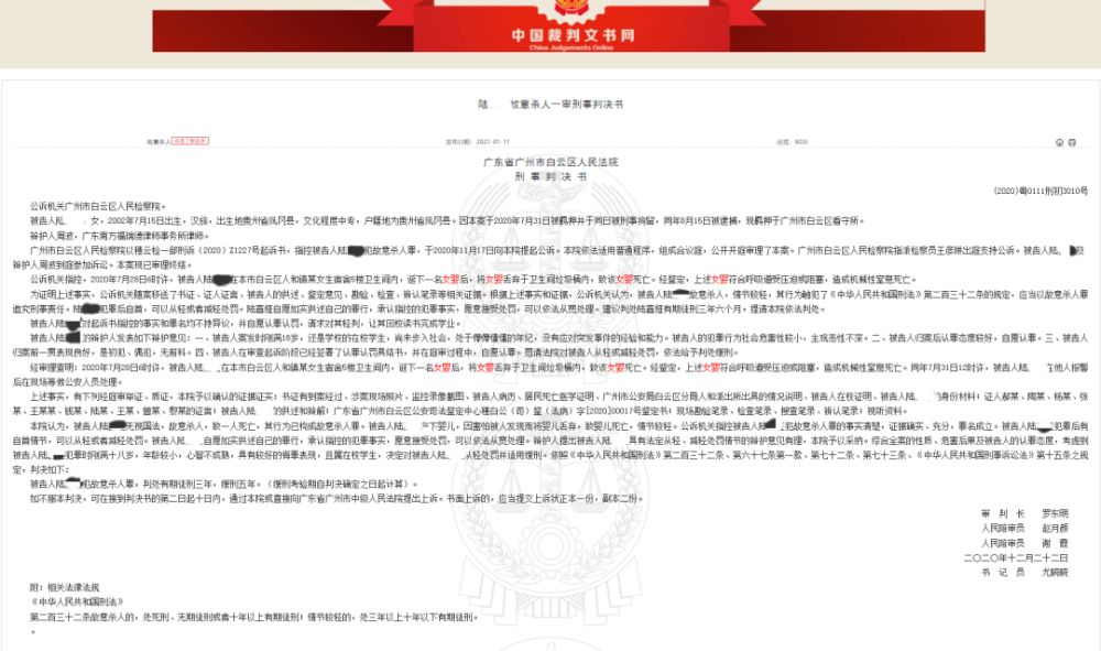 2020年7月28日6时许,18岁的陆某在广州市白云区人和镇一女生宿舍5楼卫生间内,诞下一名女婴后,将女婴丢弃于卫生间垃圾桶内,致该女婴死亡。2020年8月15日,陆某被逮捕。最终,陆某一审被判有期徒刑三年,缓刑五年。