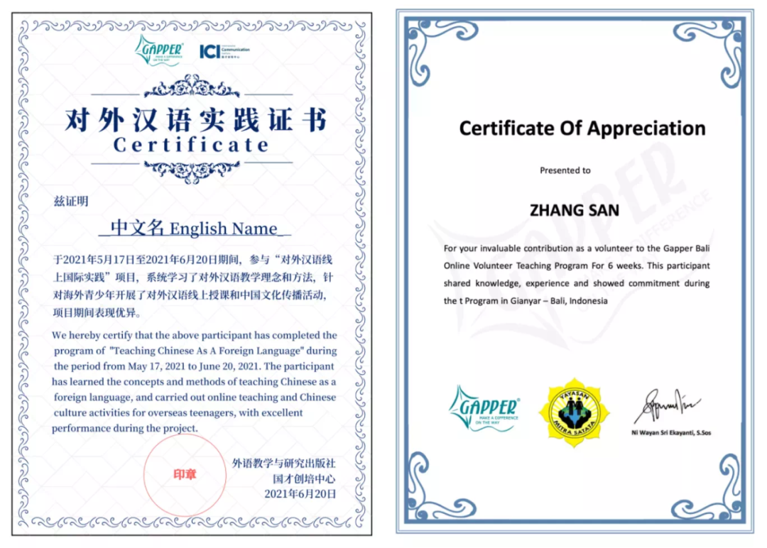 在完成本次授课任务后,将获得一份由外研社颁发的对外汉语实践证书,以及一份由GAPPER与当地NGO组织共同签发的国际志愿者证书。