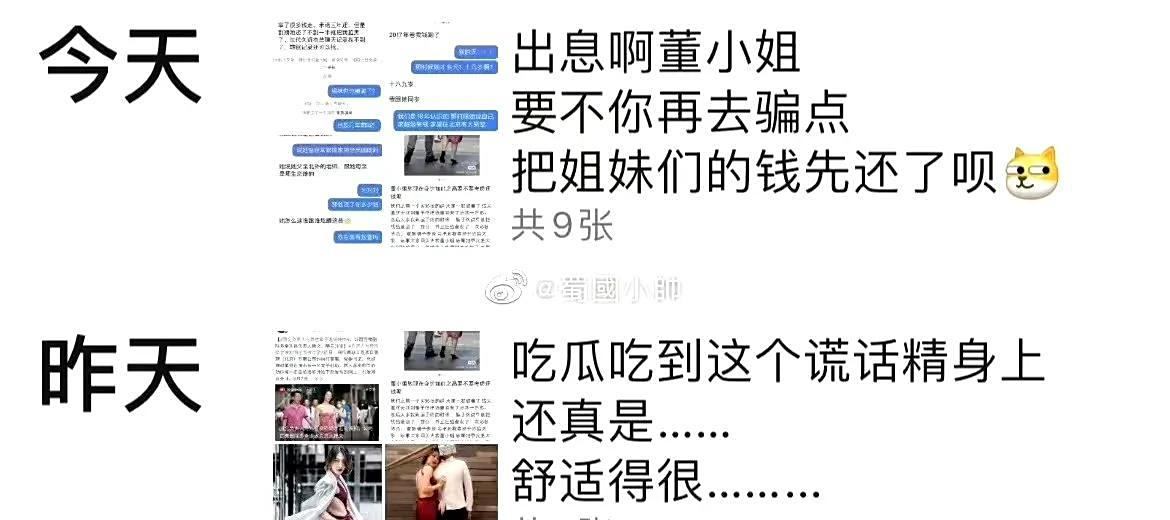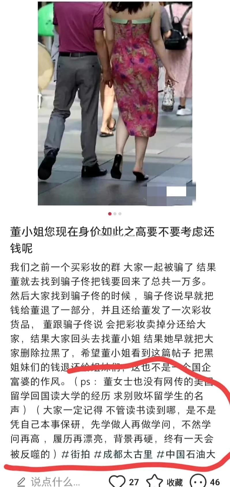 还有网友爆料称,董某并没有去美国留学的经历,她十八九岁就开始做微商和化妆品生意,很有经济头脑。早些年她在一个群里做彩妆生意,被人骗了一万多,大家去找骗子,结果发现董某已经拿回了一半的钱,还有一些货物。她承诺卖了之后给大家分钱,没想到大家都被她拉黑了。