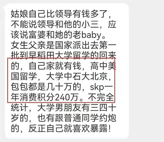 不过,之前也有网友爆料称,董某是在美国读的高中,这让网友猜测她是不是自己给别人炫耀的。因为查看董某的经历,她人生中并没有在美国留学的照片和相关信息。董某自从考上石油大学之后,她的人生就发生了很大变化。