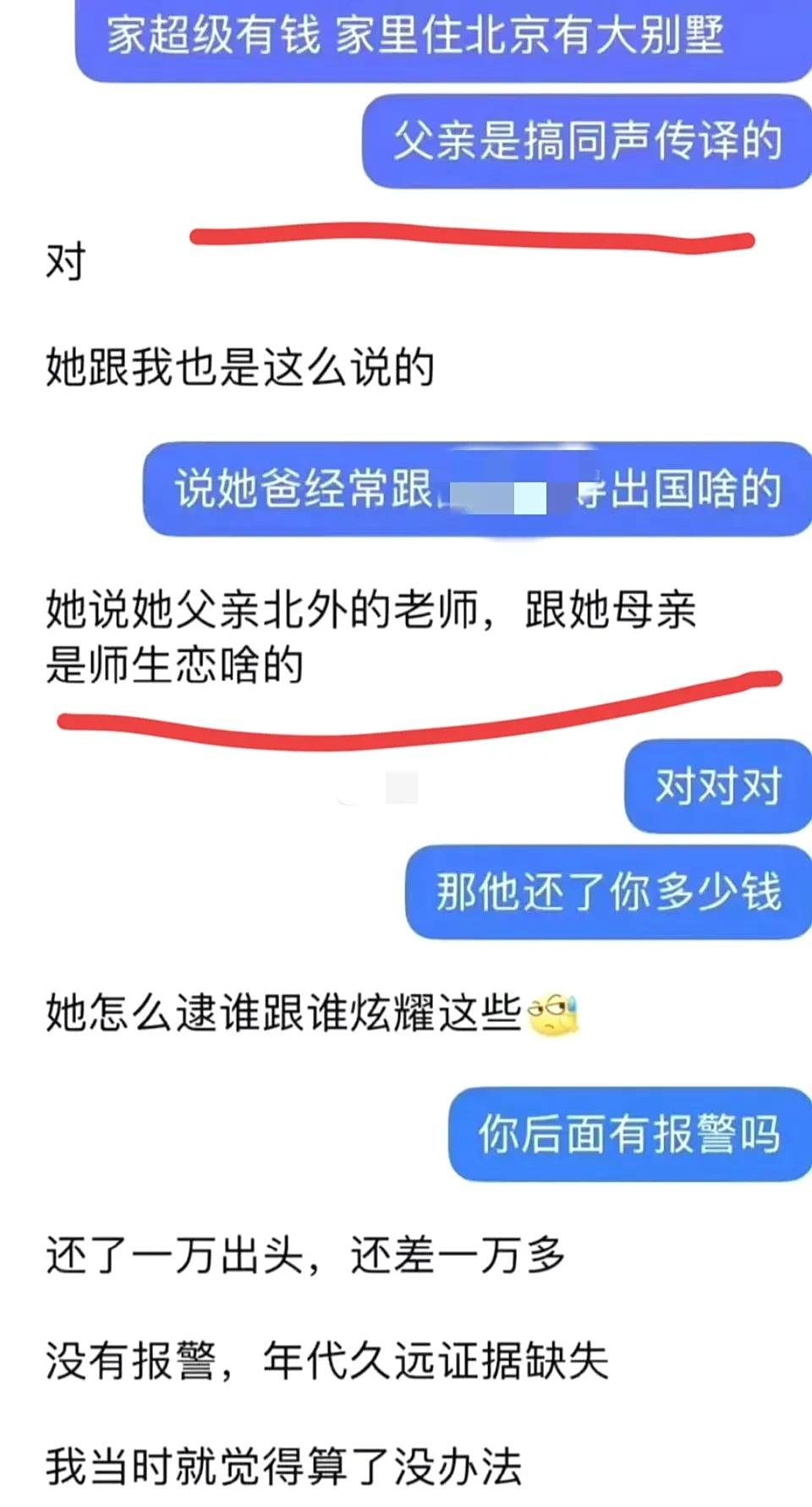 董某给借钱的朋友这样形容自己的家庭,说她父亲是是搞同声传译的,家里非常有钱还住的大别墅。她爸也经常出国,是一名北外的老师,有意思的是董某还给别人说她爸爸和她母亲是师生恋。董某还了朋友一半的钱,剩下的一万多她一点也没有想还的意思。