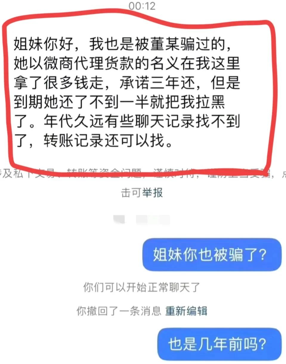 网友爆料称,2017年的时候,董某以做微商代理货款的名义,从她手里借了很多钱。董某承诺三年还清,但是到期她只还了一半就把好友拉黑,剩下的钱她不想还了。