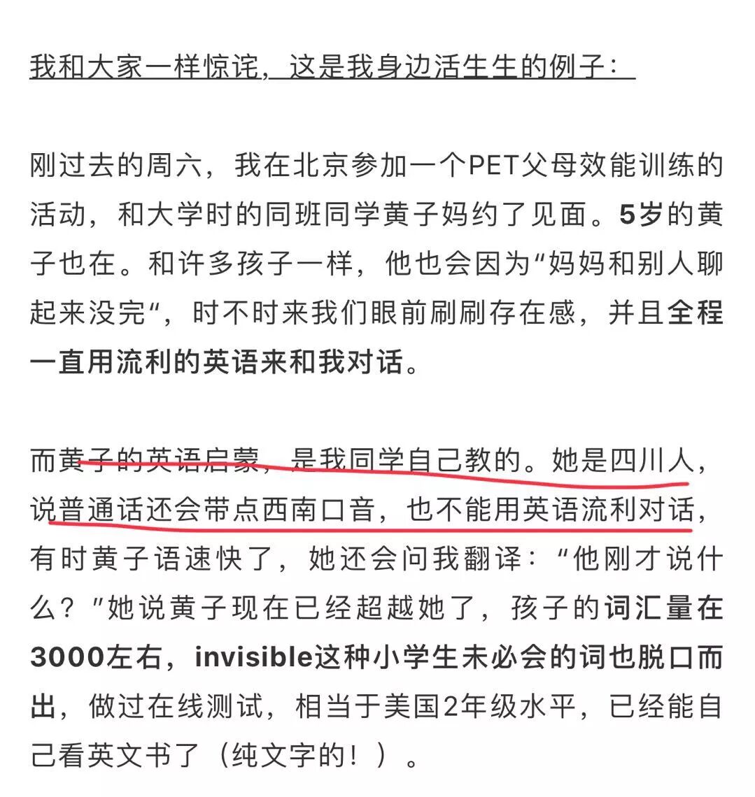 高效易行:原版读物、影视资源的丰富,给孩子的学习材料随处可见;各类少儿英语专家、达人妈妈都在分享方法,可操作。而且,大多数父母都有一定的英文基础,很容易上手带娃,且效果可见。亲子启蒙的成功案例,也不断有家长在分享。