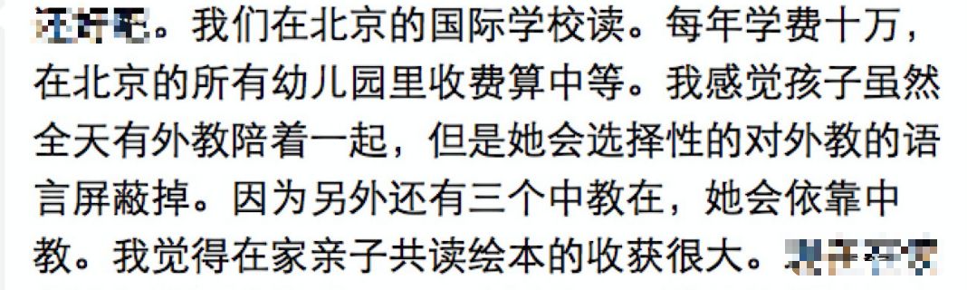国际学校,省时省力,但动辄十多万一年的费用,对我们这样的工薪家庭来讲,是笔不小的支出。即便是国际学校,也不一定保证孩子一口流利的英文,我在妈妈交流群里,看到一位妈妈的反馈: