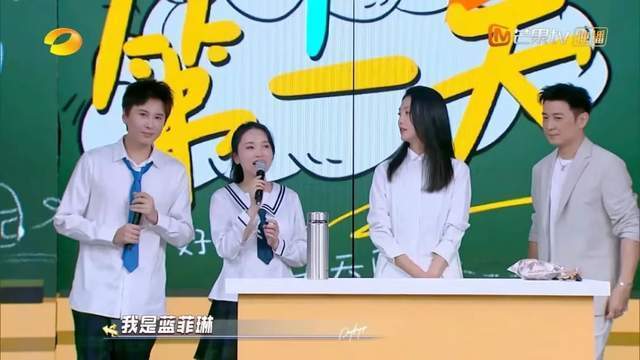 金莎穿着校裙自我介绍:“大家好,我是蓝菲琳”,暗恋她的石延枫笑着站在旁边。