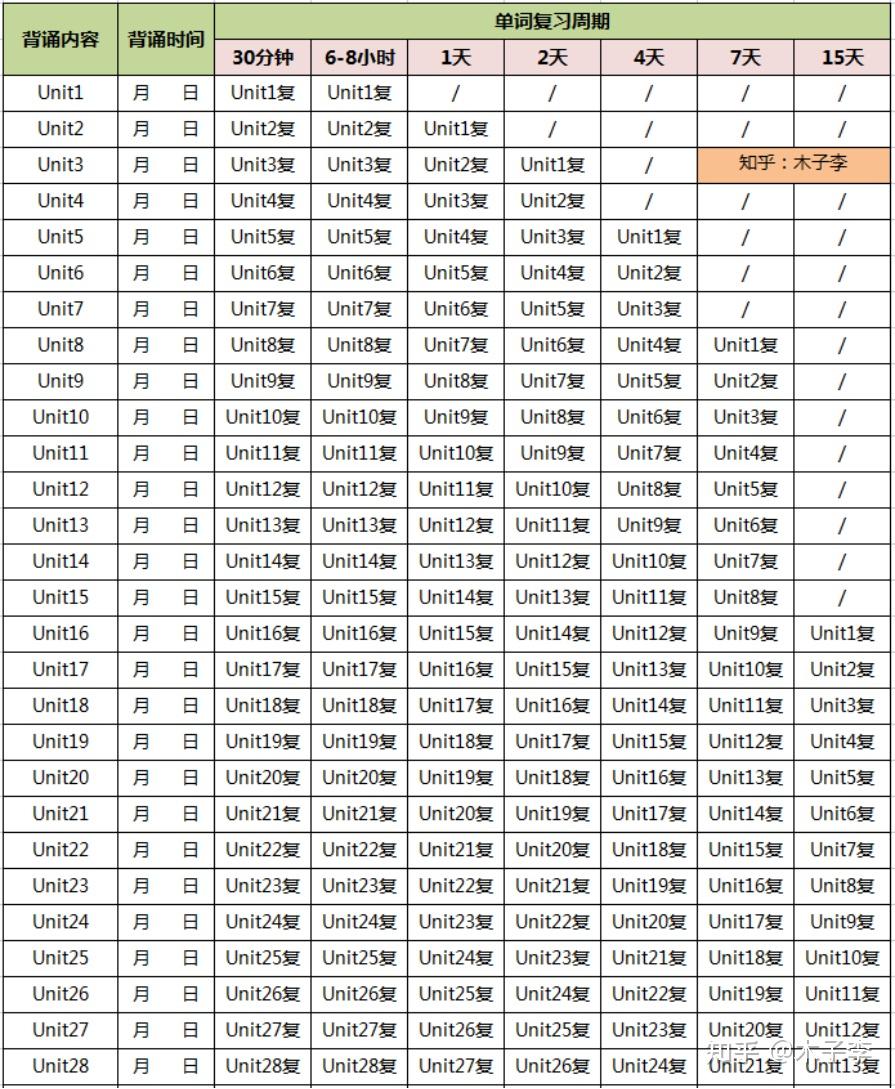 【注意要点】:一定要严格按照表格重复,不要偷懒!不要偷懒!不要偷懒!如果偷懒一次,漏下一两个单元,今天耽误了,那明天想补救就会很难。比如,你3月20号背诵了Unit 12,你不仅要在30分钟后和晚上睡觉之前复习两遍Unit 10,你还需要在背完Unit 12后同步复习之前背过的Unit 9、Unit 8、Unit 6、Unit 3。