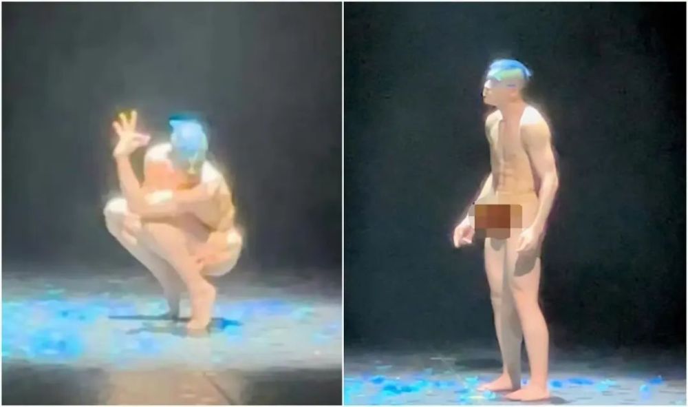 照片中的男舞者全身只穿着一条肉色紧身打底裤,侧躺在女舞者怀里的时候,舞台光打上去,看起来就像全身赤裸。