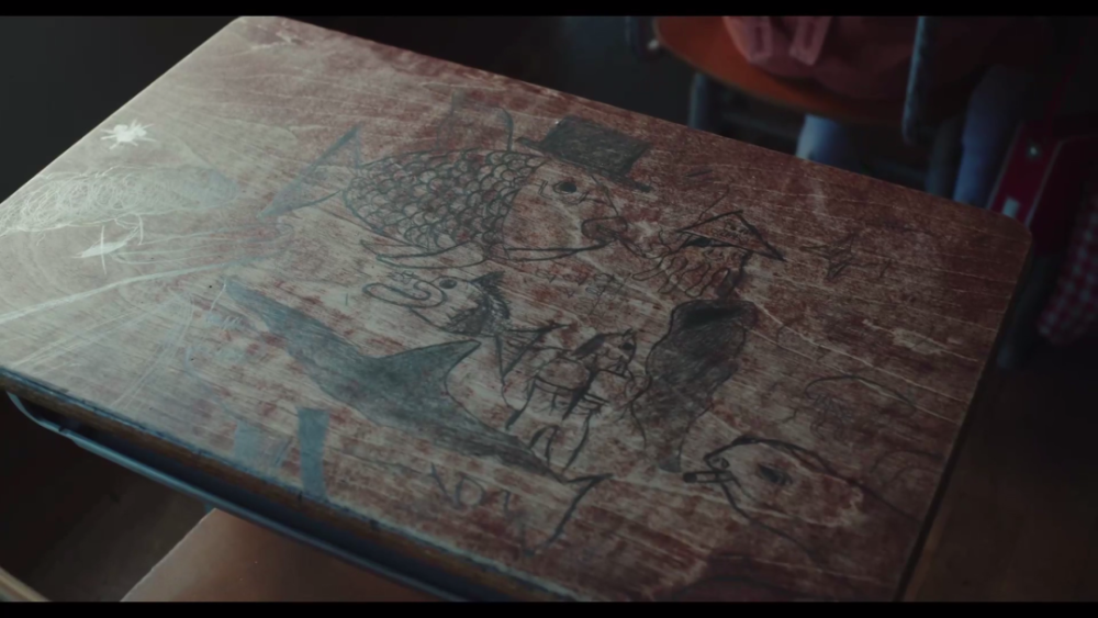 △ 空荡荡的课桌只剩竹本画的鱼