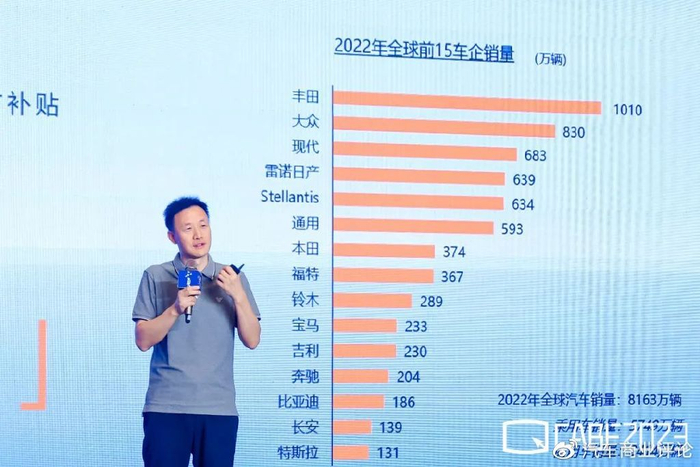 其实三年前大家都在讨论这些传统的车企什么时候会死掉,现在传统车企的掌门人在说新势力什么时候会死掉,或者未来只剩东西南北中打麻将一样就五家(车企),都在各种贩卖焦虑。都想去贩卖焦虑,都想把别人给按死。我觉得第一个就是文明竞争,不要恶性的。咱们汽车行业原来我觉得很文明,怎么现在越来越不文明了,大家越来越像原来的互联网企业,你把我搞死,我把你数一数二不三不四了。这个市场其实足够大的,还有海外巨量的海量的市场,但是你看现在竞争的一个是焦虑,第二个就是有些心态失衡。第二个就是期待统一的大市场。我们现在各种地方性的一些限制,其实真的是阻碍了地方大市场发展。你会发现你现在竞争的不是单个企业,你竞争的是跟它后头的“爹”和“妈”在竞争。这个违背了市场的公平性。第三个就是不要贩卖焦虑,就是我刚才讲的,让事实说话,让时间来证明,把自己的事干好,在用户市场上做竞争,服务好你的用户,把你自己的能力练起来,不着急划势力范围,怎么像西方列强进入中国一样的口吻。不好。我也让同事们画了2022年全球15家车企(排名),我们中国车企有长足的进步,前15家还有那么几家,但是前10位里头根本就没有我们,这个还有很长很长的路要走,但是你看我们的内部,一帮幼儿园小朋友在里头死掐,成年人还在外头看着呢。所以第一,中国的车企有长足的进步,在电动车时代有很强的竞争力,这是第一个结论。第二个结论,我们都还很弱小,还有很长的路要走。汽车是个长周期的行业,都得要修炼内功,都得要继续努力。也告诉我们不要自满、不要气馁,最好也不要损别人。——张勇(哪吒汽车联合创始人、CEO)