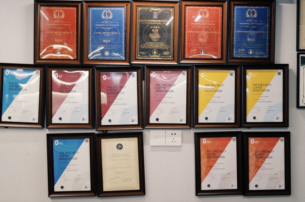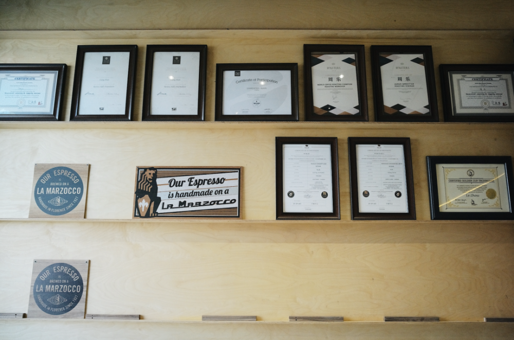 这是一家获奖无数的咖啡馆,整面墙上都是主理人周乐老师所获得的荣誉。
