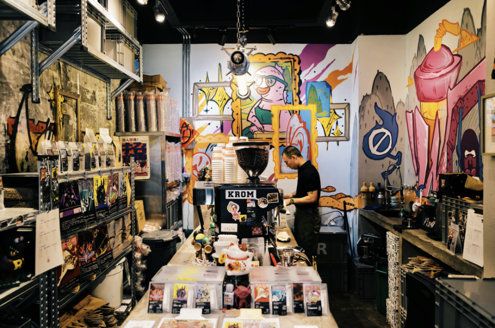 咖啡店的墙壁是街头涂鸦风格,上面被画满了怪兽,架子上也是摆满了各种怪兽玩具。是一家有个性的独立咖啡店。