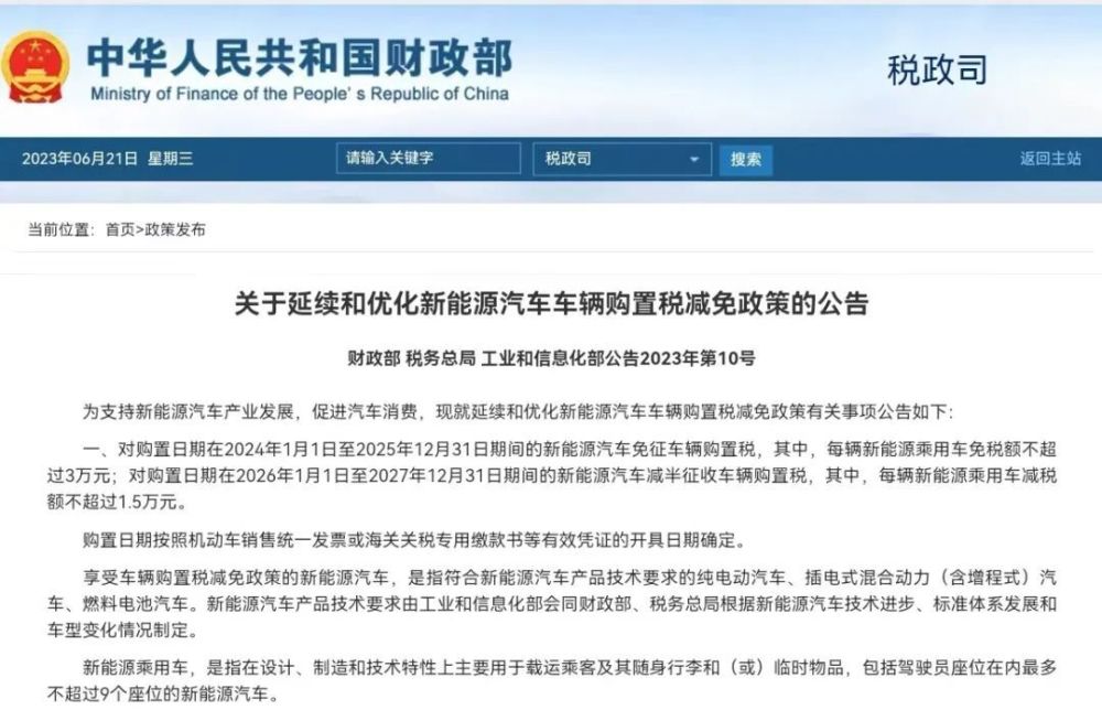 关于延续和优化新能源汽车车辆购置税减免政策的公告/财政部官网