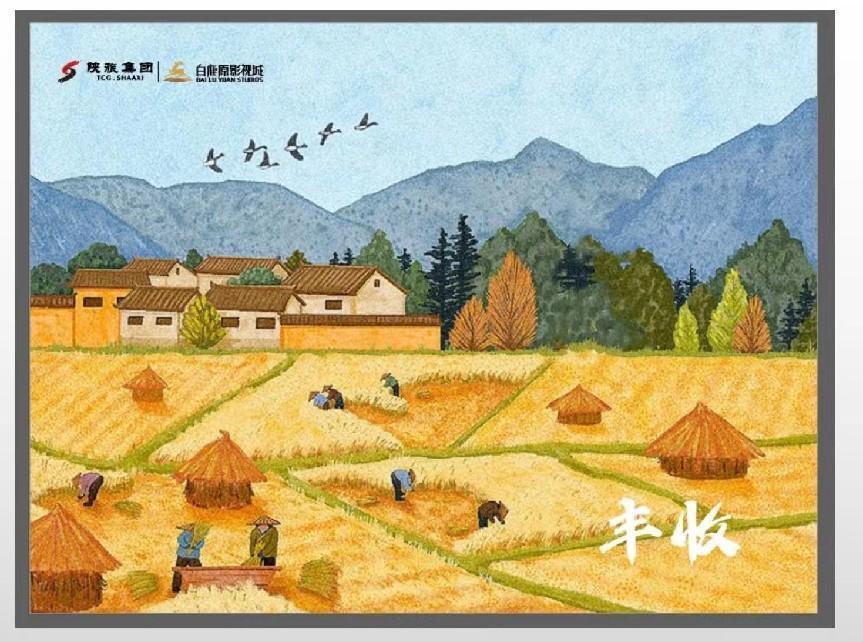 白鹿原地处关中腹地,悠悠古塬传承千年的农耕文明印记随处可循,随处可见麦草垛、草编人偶,尤其是草编牵牛打麦场的实景再现,营造了丰收、喜庆、欢乐的氛围。