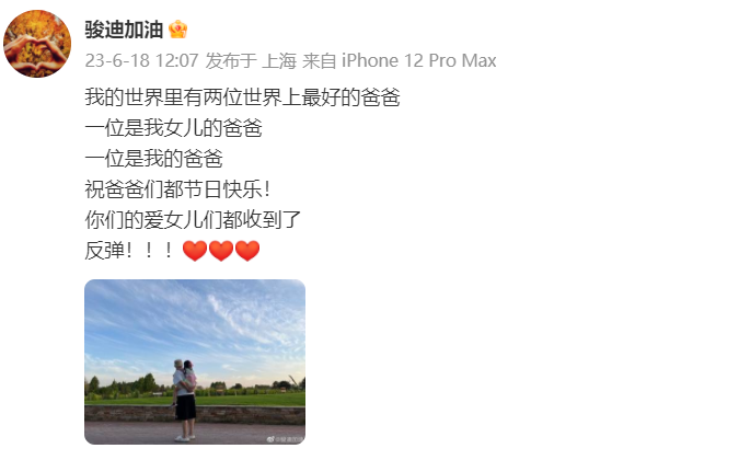 王骏迪祝爸爸们节日快乐,并喊话自己父亲和老公孙红雷:“你们的爱女儿们都收到了”,发文十分用心。