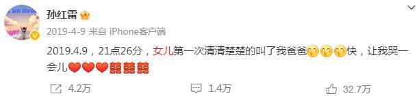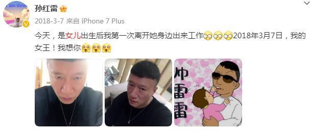 47岁才迎来女儿的的孙红雷可以说是宠女如命,有了女儿之后,他会在社交平台记录下与女儿相处点滴。比如第一次离开女儿外出工作,孙红雷满是不舍都快哭了;他还会记录下女儿成长过程中的每一个第一次,第一次叫爸爸,第一次夸爸爸帅气等等。