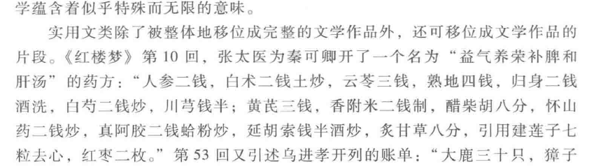 它后面又举了一个例子,是《红楼梦》第10回里张太医给秦可卿开的益气养荣补脾和肝汤,里面有一个药方。在53回元春省亲里,又开出了乌进孝的账单。