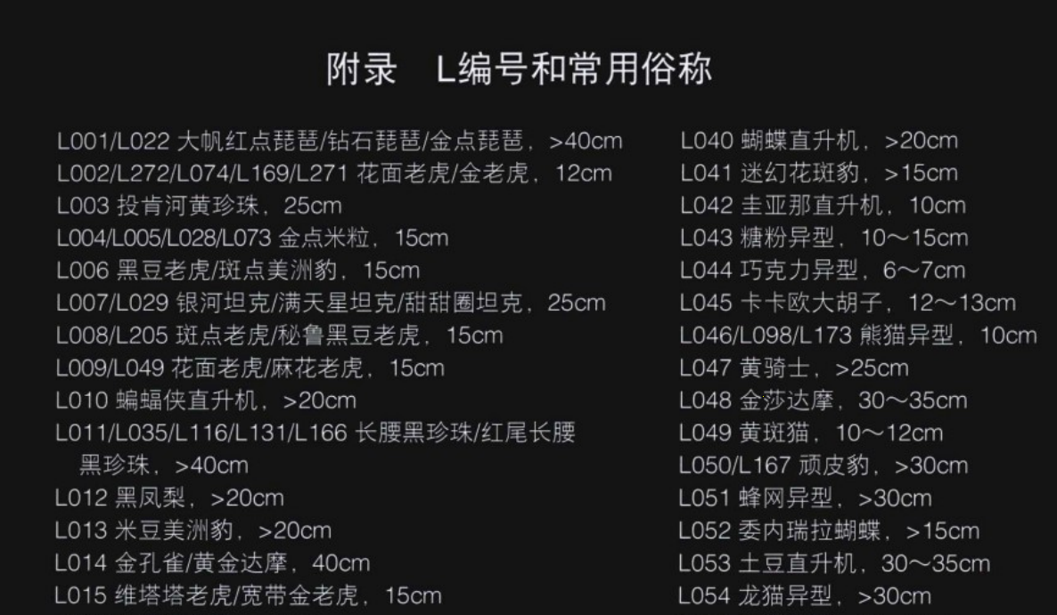 所有的吸甲鲶编号都是以L开头的,指代吸甲鲶科Loricariidae,而L后面的每个号码相对应一种新发现的吸甲鲶,号码的排列以发现的先后次序为准则。所以大家看编号数字的大小就可以判断每种吸甲鲶发现的早晚。