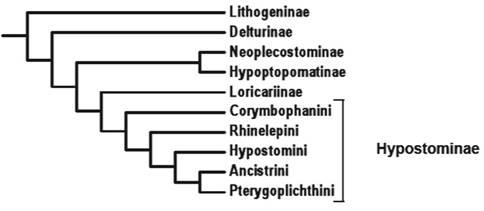 在具体关系方面,石星鲇亚科(Lithogeneinae),包括石星鲶Lithogenes 和Astroblepidae,是吸甲鲶科内其他亚科的姐妹群; 三角下口鲇亚科(Delturinae)是最早分化的谱系,而下口蜻鲇亚科(Hypoptopomatinae)和新吸口鲇亚科(Neoplecostominae)关系较近,钩鲶亚科(Ancistrinae)、下口鲶亚科(Hypostominae)和甲鲶亚科( Loricarinae)关系较近。