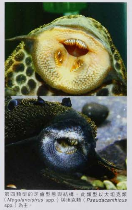 第三种类型的口器,下钩鲶属Hypancistrus sp L173第四种类型以大坦克类(大勾鲶属Megalancistrus spp.如巨无霸异形M. parananus,L113)、坦克类(假棘甲鲶属Pseudacanthicus spp.)·如裳红剑尾坦克Peudacanthicus.cf. serratus”)为主要鱼种,在牙齿的型态上与第三类相同,皆类似为汤匙状的型态,但整体结构排列上却是排状,与第三类型明显不同。此类型的异形食性已经完全不同于过去的认知,因为它们在环境里对食物的利用相当多元,尤其会以动物性食物为食物来源,如动物尸体鱼肉,而非仅以植物性食物为主。