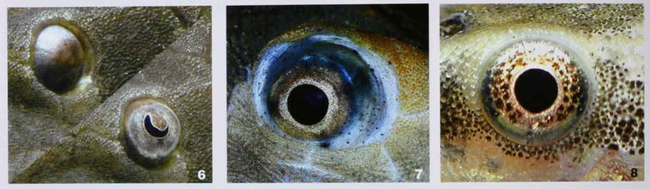 同时,为了适应夜行生活,吸甲鲶科的眼睛于角膜和虹彩层、水晶体之间演化出了瞬膜(Nictitating Membrane,类似眼睑的器官),借以调节光线进入眼睛内的量。它们的眼睛会和陆生脊椎动物一样,随着光线亮度的不同而改变:时而呈水滴状?时而呈半月状,或是呈现完全开的型态。