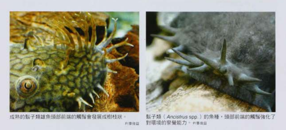在此习性的影响下,钩鲶属Ancistrus,也就是所称的“胡子鱼”,出现了最大的两性异形。大多数钩鲶属物种的成熟雄性在其鼻子上都有明显的肉质触须。鼻触须也出现在雌性和幼体中,但通常更小、更少,分布也更窄。这种触须与生殖活动有关,是一种欺骗性的交配策略:雄性钩鲶进化出鼻部触须,来模仿幼鱼的尾巴,从而响应雌性对有卵雄性的偏好,使得空巢雄性能够成功地与巢中已有卵的雄性竞争。