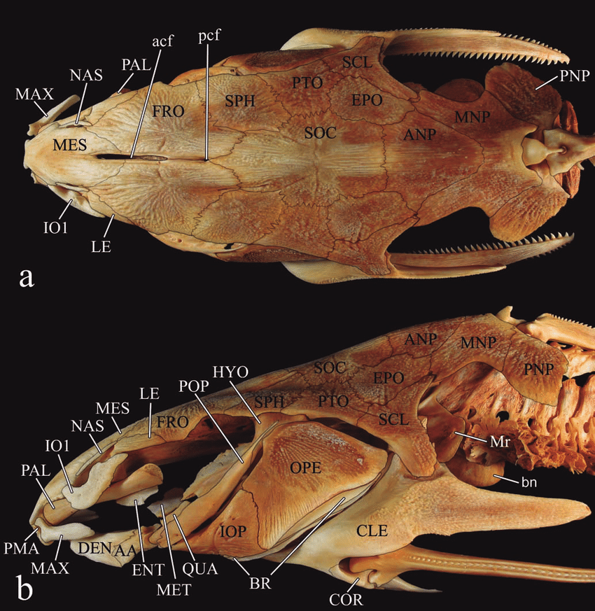 吸甲鲶高度特化的头骨,肌肉深入头部,带动棘球运动。