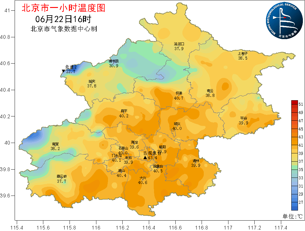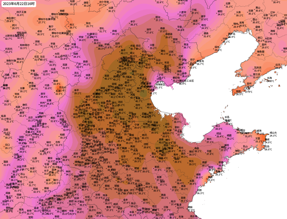 今天下午,济南、石家庄、北京、天津这四大华北平原城市都超过了40度。比如北京南郊气象站最高41.1度,是有气象纪录以来的历史第二高(并列),六月第一高。从历史数据来看,北京最高气温出现在1999年7月24日,41.9度;第二高温就是41.1度,分别出现在2002年7月14日,2014年5月29日,2023年6月22日。北京市气象局的监测数据显示,不仅北京多个区气温都超过40度,部分自动站气温超过43度,今天可谓是热浪滚滚。