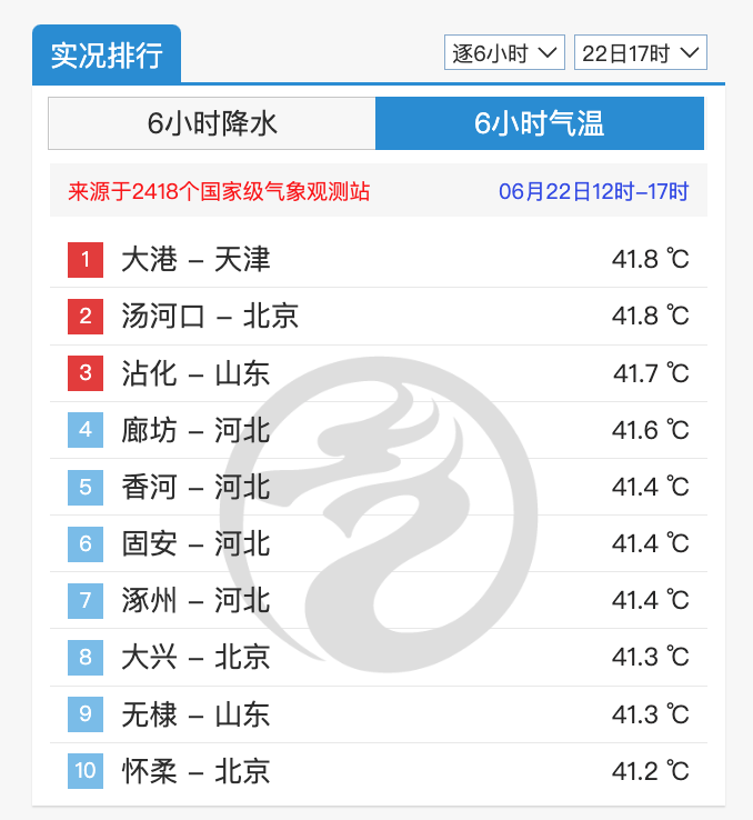 根据中央气象台的统计,今天下午,北京天津山东取代了吐鲁番盆地站上了高温榜前三名。而且从排行榜上可见,北京天津山东河北四省市不少站点气温都超过了41度,虽然在雨季开始前的干热高温季,40度并不是稀客,但像这样大范围出现40度以上酷热天气仍不多见。