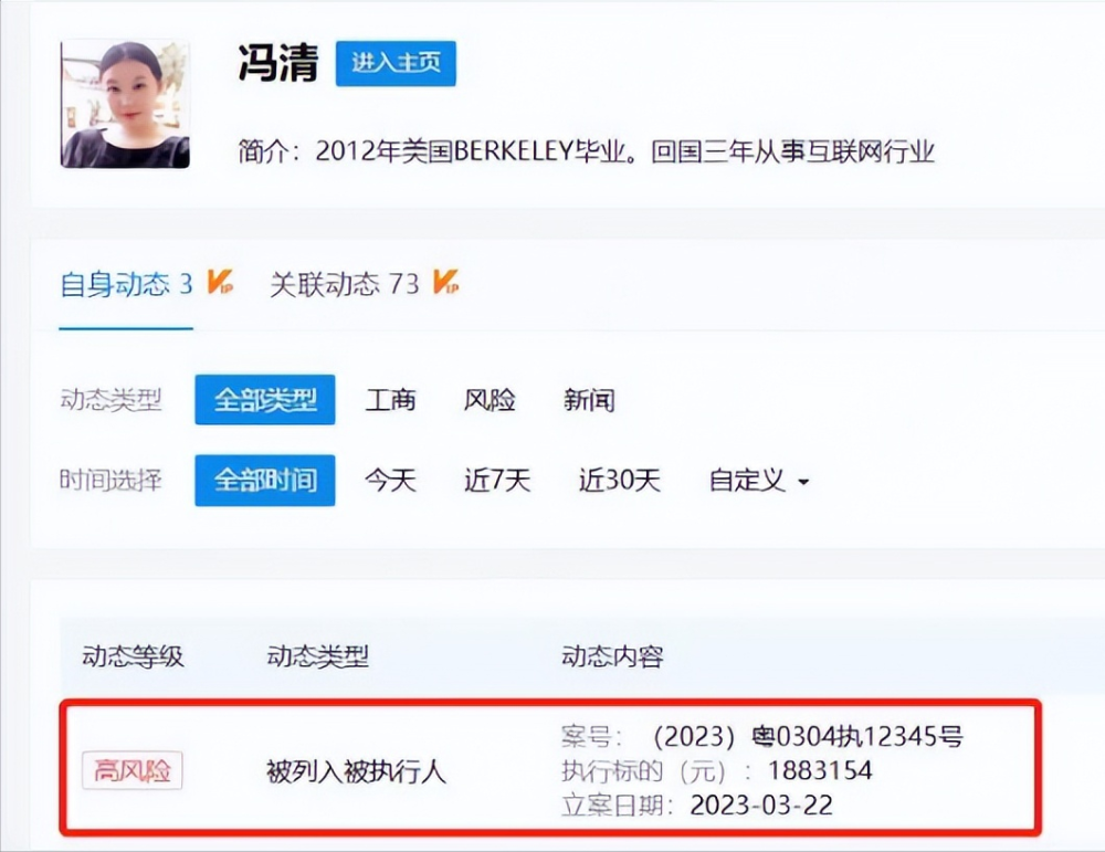 今年4月,有网友忽然发现,冯清出现在被执行人的名单之上,理由是旗下的公司拖欠188万余元不还。
