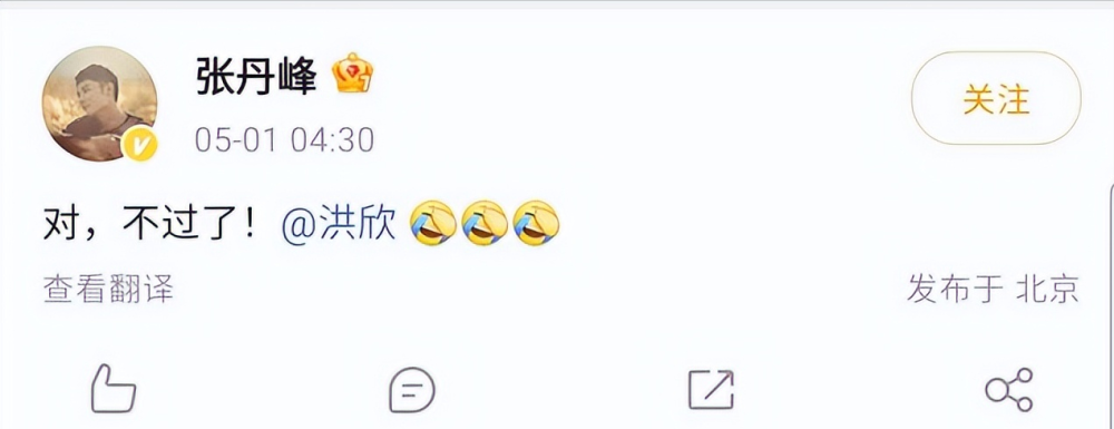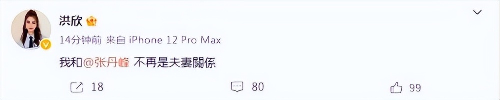 直到今年5月1日凌晨,洪欣忽然在社交媒体发文称,已经结束了张丹峰的婚姻关系,男方也出面回应:“不过了。”