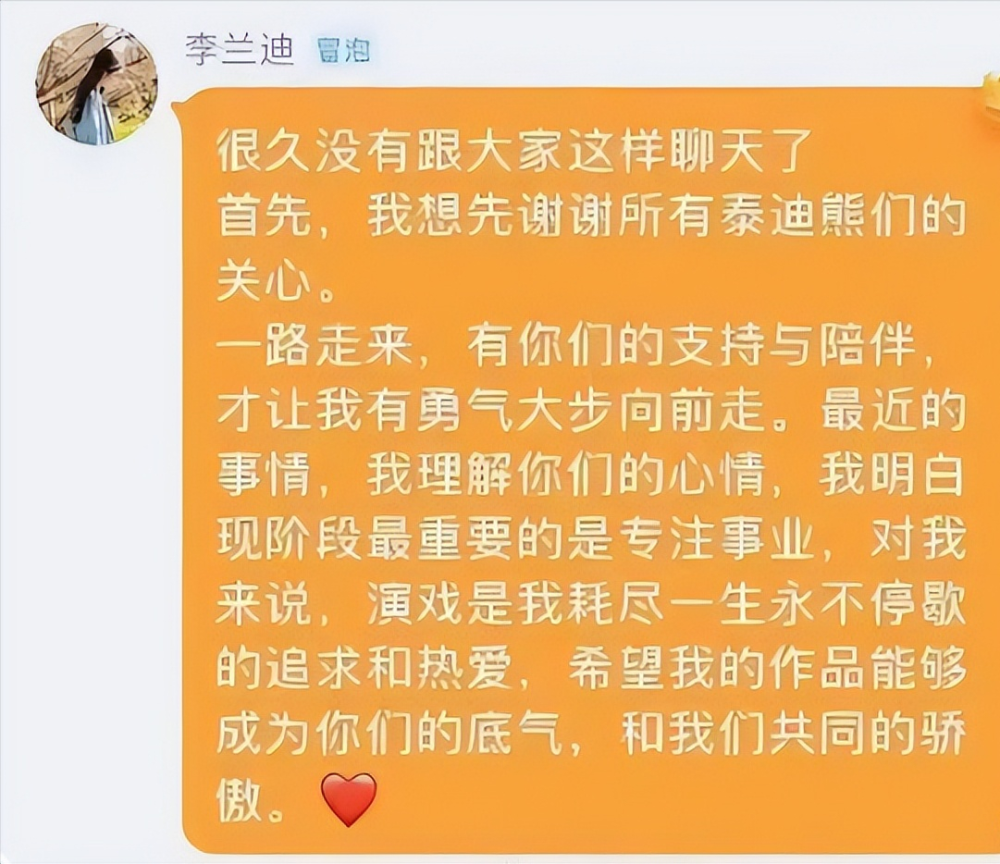 照片被曝光引起关注之后,李兰迪忽然空降粉丝群,侧面回应了此事,表示自己“理解大家的心情,也知道现阶段要专注于表演”,但是……的话虽然没出来,却疑似承认。