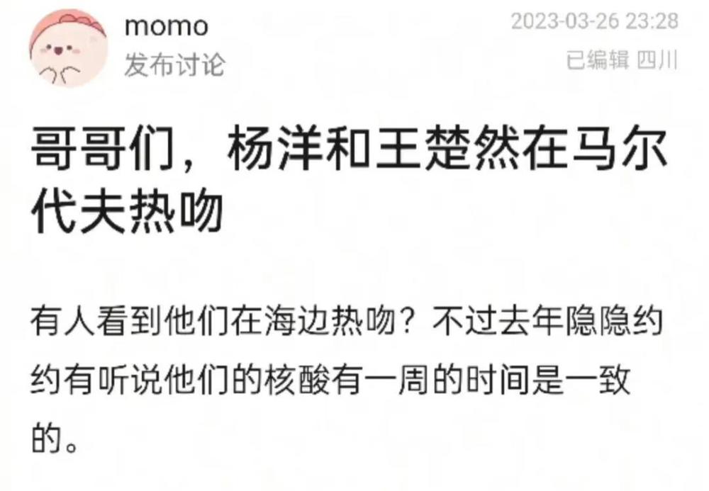同样是3月,“顶流”杨洋忽然被网友偶遇在马尔代夫,和“99花”王楚然亲密拥吻,疑似恋情曝光。