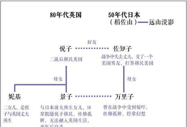这里必须要交待的是:悦子本是一个日本女人,和日本丈夫生下了长女景子,后来带着景子去了英国,和英国丈夫生下了小女儿妮基。