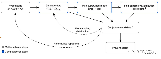 在《自然》杂志的一篇文章中DeepMind的研究人员提出了一个选代的工作流程,涉及数学家和监督ML模型(典型的是NN)。数学家假设一个函数涉及两个变量(输入X()和输出Y())。一台计算机生成大量的变量的实例和神经网络拟合的数据。梯度显著性方法用于确定X》中最相关的输入。数学家可以转而完善他们的假设和/或生成更多的数据,直到猜想在大量数据上成立。