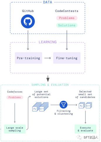 DeepMind的AlphaCode解决了一个不同的问题:在竞争性编程任务中生成整个程序。它在Codeforces一个编码竞赛平台上排名前半。它是预先训练的对GitHub数据和Codeforces问题和解决方案进行微调。然后对数百万个可能的解决方案进行采样、过滤和聚类,以获得10个最终候选方案。