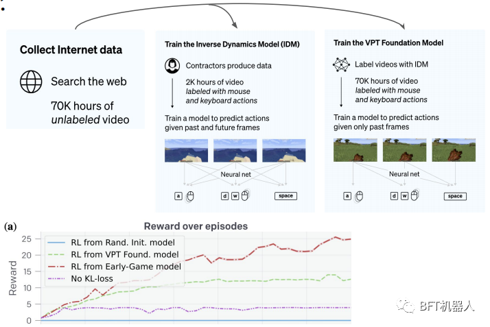 OpenAl收集了2000小时的标记有鼠标和键盘动作的视频并训练了一个逆动力学模型(IDM)来预测过去和未来的动作一一这是预训练部分。