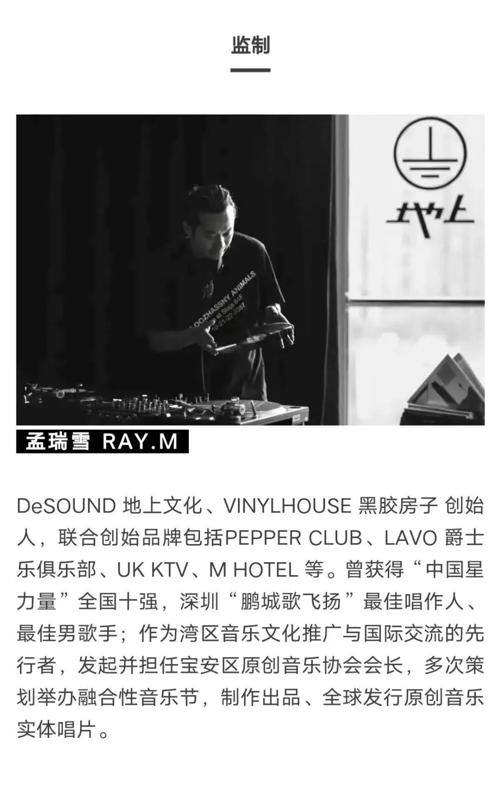 Producer、DJ,同时也是VINYLHOUSE 唱片店的主理人之一。参与的配乐有2019深圳时装周宣传片配乐、ELLASSAY S/ S 2019 Milan Fashion Show 秀场与宣传片配乐、Vivo Lab 宣传片配乐、深圳时装周概念片配乐、ROARINGWILD 两季秀场配乐等…? 曾在阿姆斯特丹的电台 Red light radio 分享音乐,以及德国柏林的RBL FINESELECTION 和 KITCAT CLUB等进行演出。