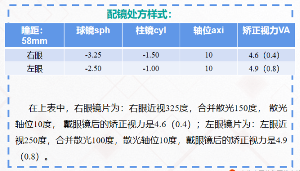 配镜处方样式与解读:在电脑验光或检影验光之后,进行主觉验光、试戴矫正,而配镜的处方需要根据个体差异进行调整,与年龄、戴镜习惯、双眼视功能参数等均相关,需要医生综合考虑给出一个“最适宜”孩子的配镜处方。比如表单中球镜sph -3.25、柱镜cyl-1.50、轴位axi10、矫正视力VA4.6(0.4),表示为右眼近视325度,合并散光150度,散光轴位10度,戴眼镜后的矫正视力是4.6(0.4)。
