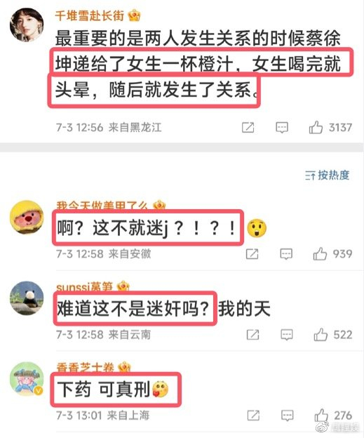 此瓜一出,网上纷纷炸锅了,表示蔡徐坤的打脸来得如此之快,刚发声明称“未和未成年人交往”,这边就直接爆出和17岁的女生发生关系。并且还疑似下药,这很明显就是“迷奸”了,如果爆炸属实,那么蔡徐坤很可能将面临刑事了。难怪网友们都称现在明星的声明就如同一张废纸,完全没有任何公信力可言。
