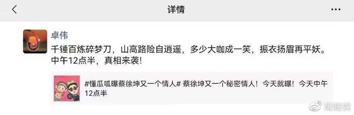 并且这位狗仔的这个预告瓜,还得到了国内第一狗仔卓伟的转发,并还特意作了一首诗。据闻这位狗仔是卓伟的徒弟,因此从这可以看出,这个瓜的真实度应该蛮高的。