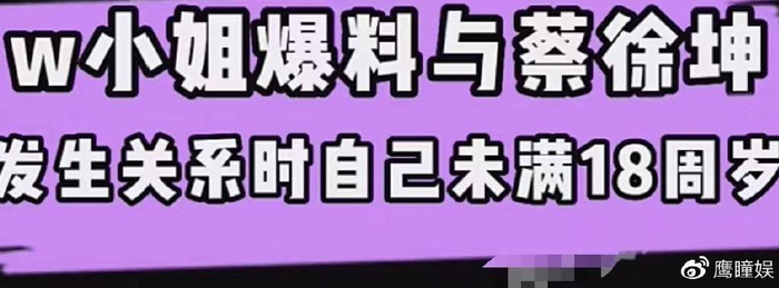 而这个预告瓜也是如期而至,该狗仔不仅曝出了蔡徐坤和这位W女士的亲密照片,而且还晒出了两人的聊天记录。而在爆料中,W女士还表示自己和蔡徐坤发生关系时才17岁,并称自己疑似被蔡徐坤下药了,所以才导致失身。