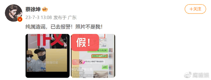 或许是见到涉及刑事犯罪,蔡徐坤此次及时发声辟谣,表示狗仔爆的料纯属造谣,并称爆料中的照片并非他,他已去报警维权!