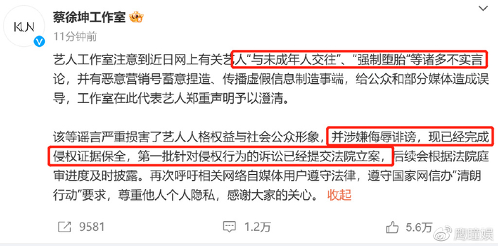 而且无论是蔡徐坤还是工作室,针对蔡徐坤母亲跟踪偷拍女方等行为,都没有针对性否认,只否认了“未成年人交往和强制堕胎”两点,而根据狗仔晒出的女方发现跟踪后报警的谅解书,他很难否认,一旦否认官方可能就会出通报。