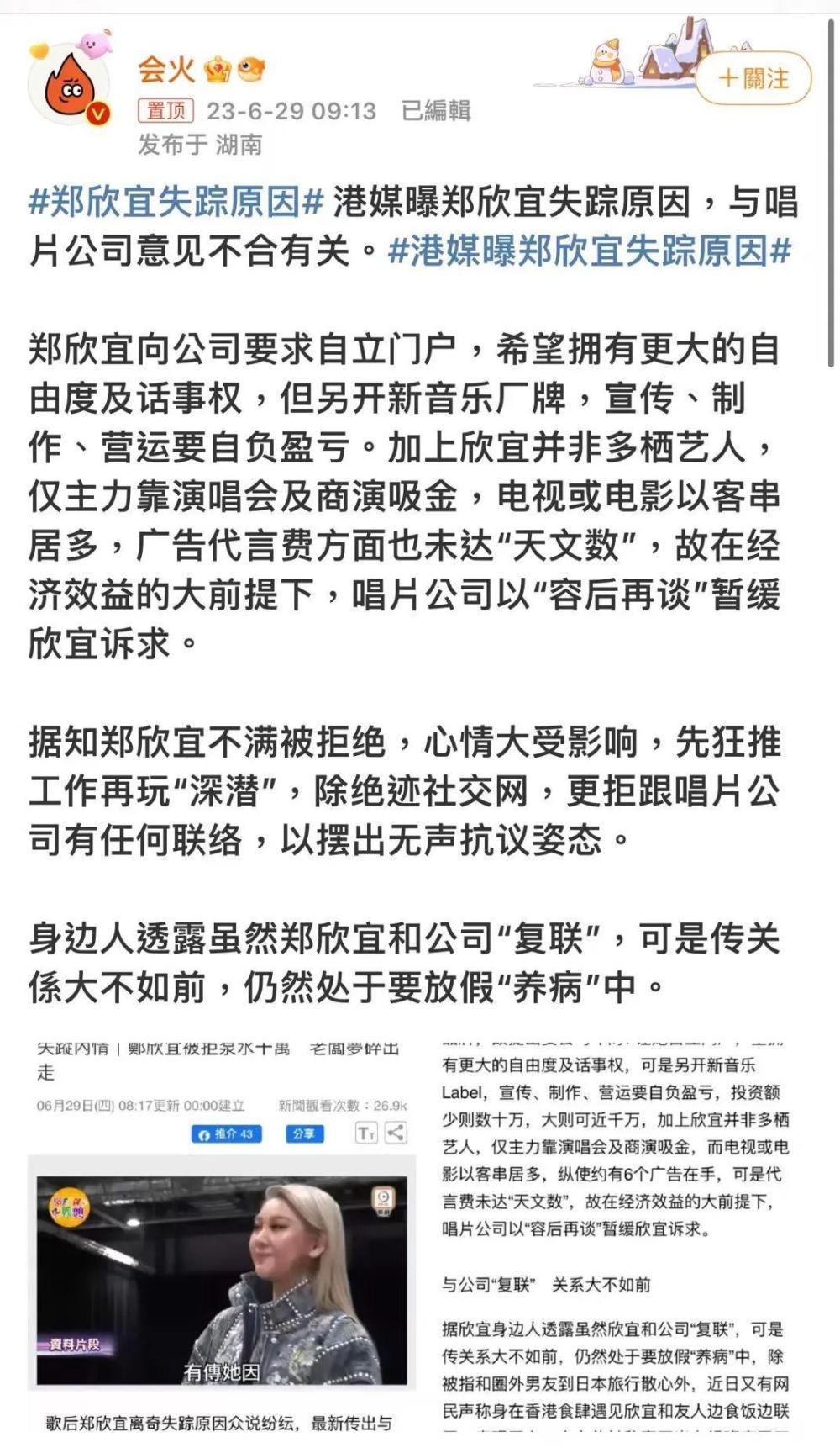 一时之间各种传闻满天飞,有说郑欣宜疑似失踪、有说她被公司雪藏、还有人说她疑似病危。