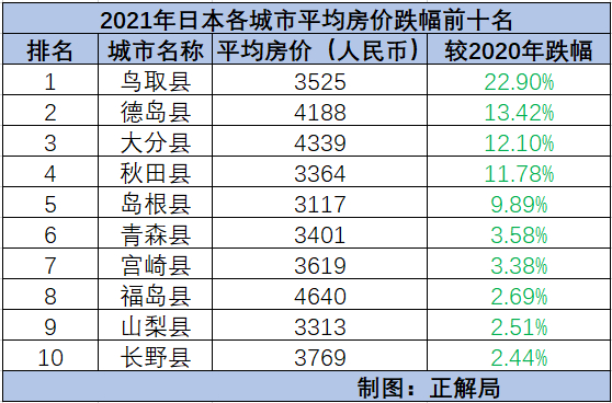 2021年,日本全国47个城市中,有13个城市的房价同比下跌,另外34个城市的房价同比上涨。