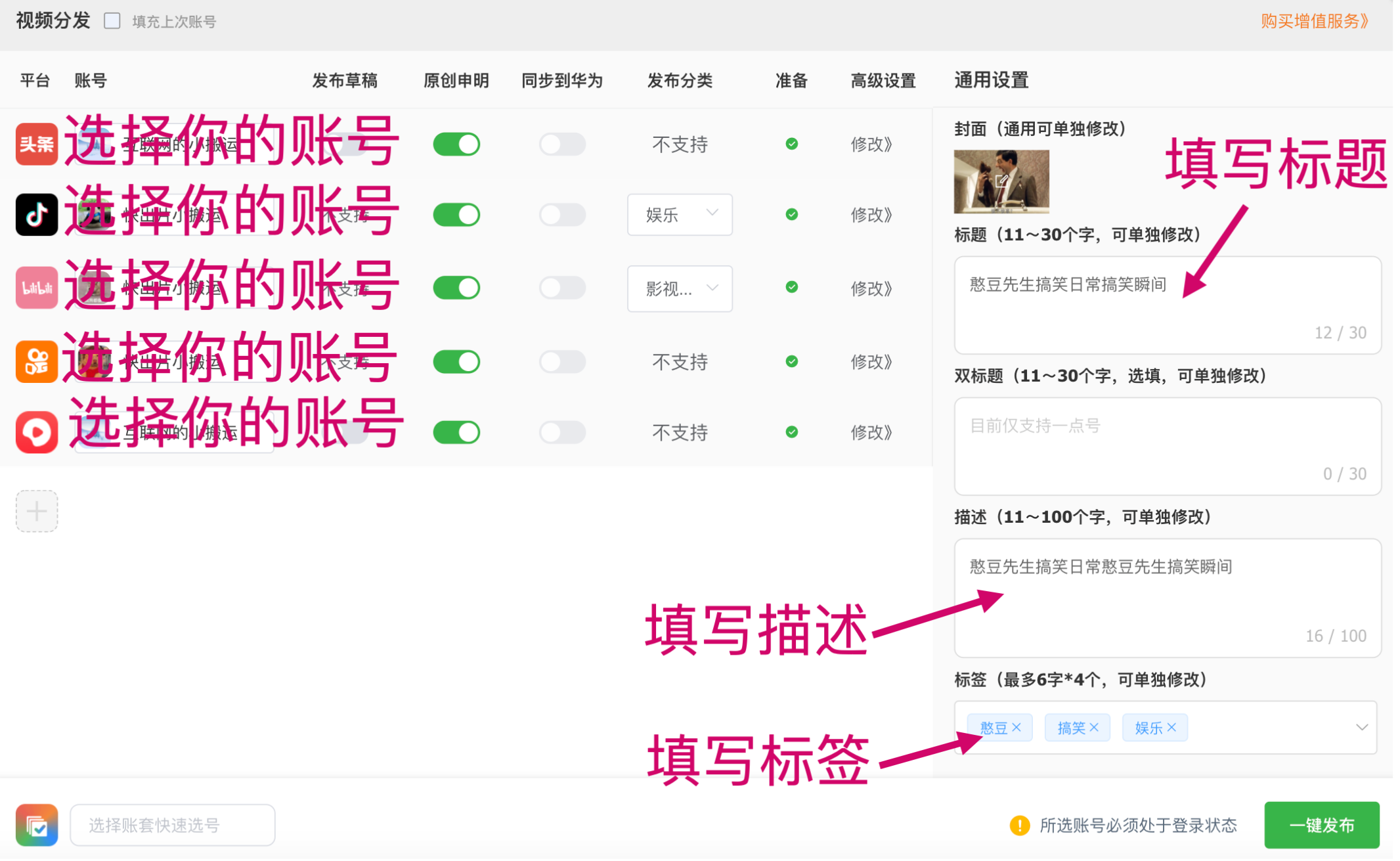 批量上传视频改写处理填写完成后点击一键分发,进入账号管理界面,选择要发布到哪些账号