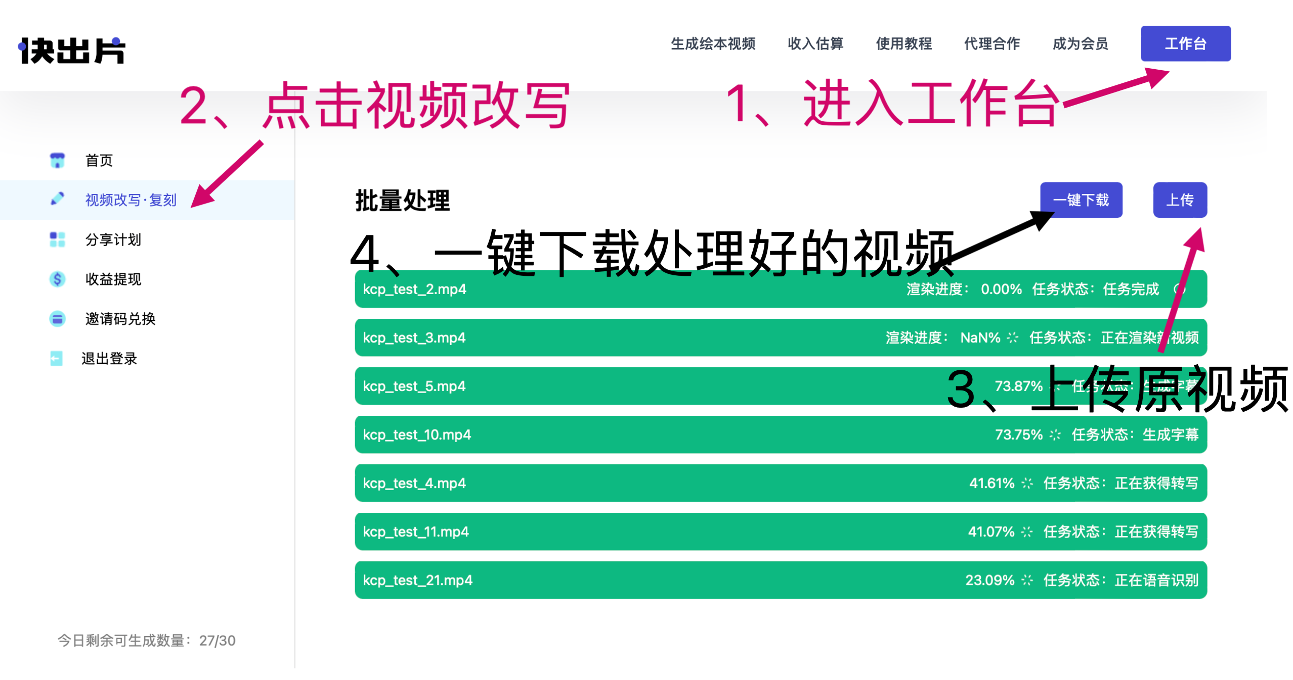 以上数据为中视频伙伴计划下面是操作流程:1、在【快出片】官网上传视频,它会自动处理,对原视频进行字幕改写(拥有多种视频风格),重新配音,重新配BGM,生成一个全新的作品,直接改的它妈都不认识!批量上传处理完成后,也支持作品批量下载。