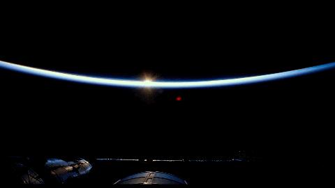 太空站的高度是450公里,飞行时速2万8千公里,每1.5小时绕行地球一圈,所以每天有16次日出日落。