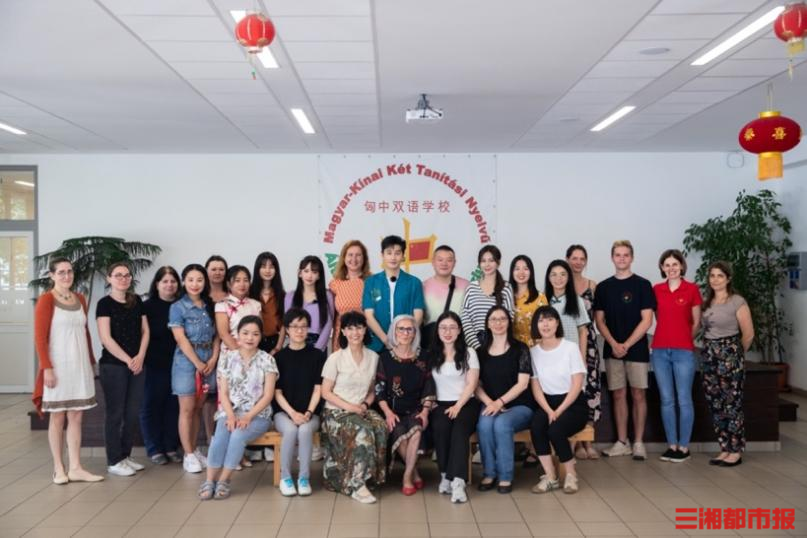 (黄晓明、岳云鹏、沈梦辰、程潇与匈中双语学校师生合影)